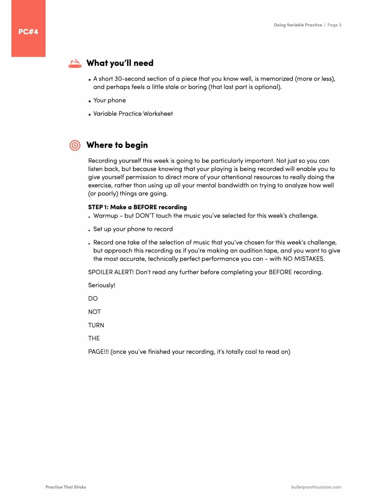 Practice That Sticks lays out the essentials of effective practice, and is essentially Module #1 of Beyond Practicing or Session #1 of Performance Psych Essentials.